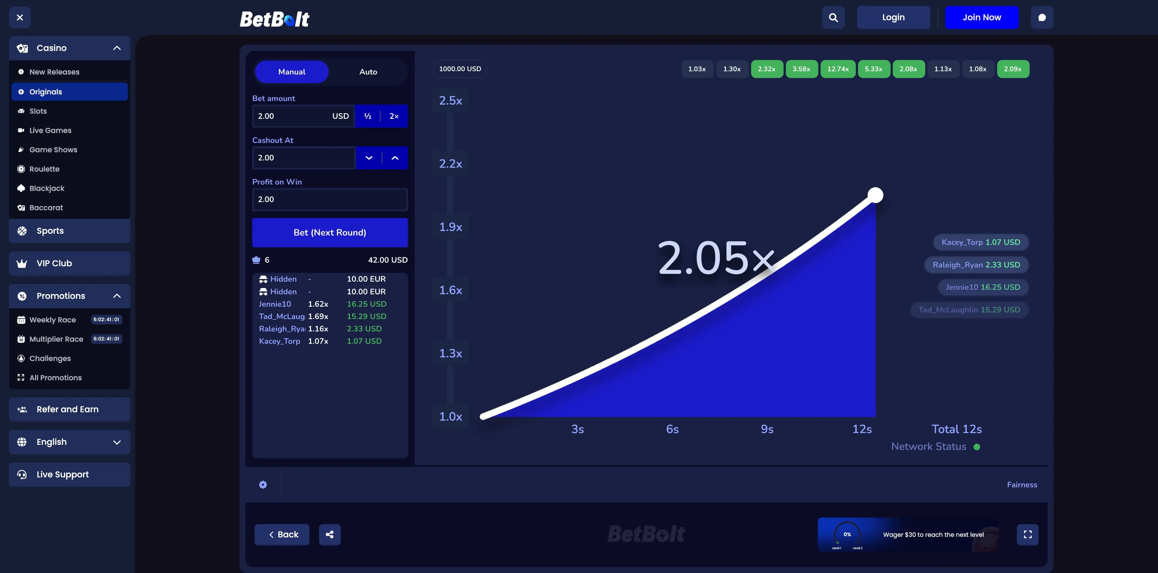 Betbolt is all crypto, all the time. They support BTC, ETH, USDT, DOGE, LTC, and other major coins. Deposits confirm quickly on-chain and withdrawals are even faster, typically processed within minutes.