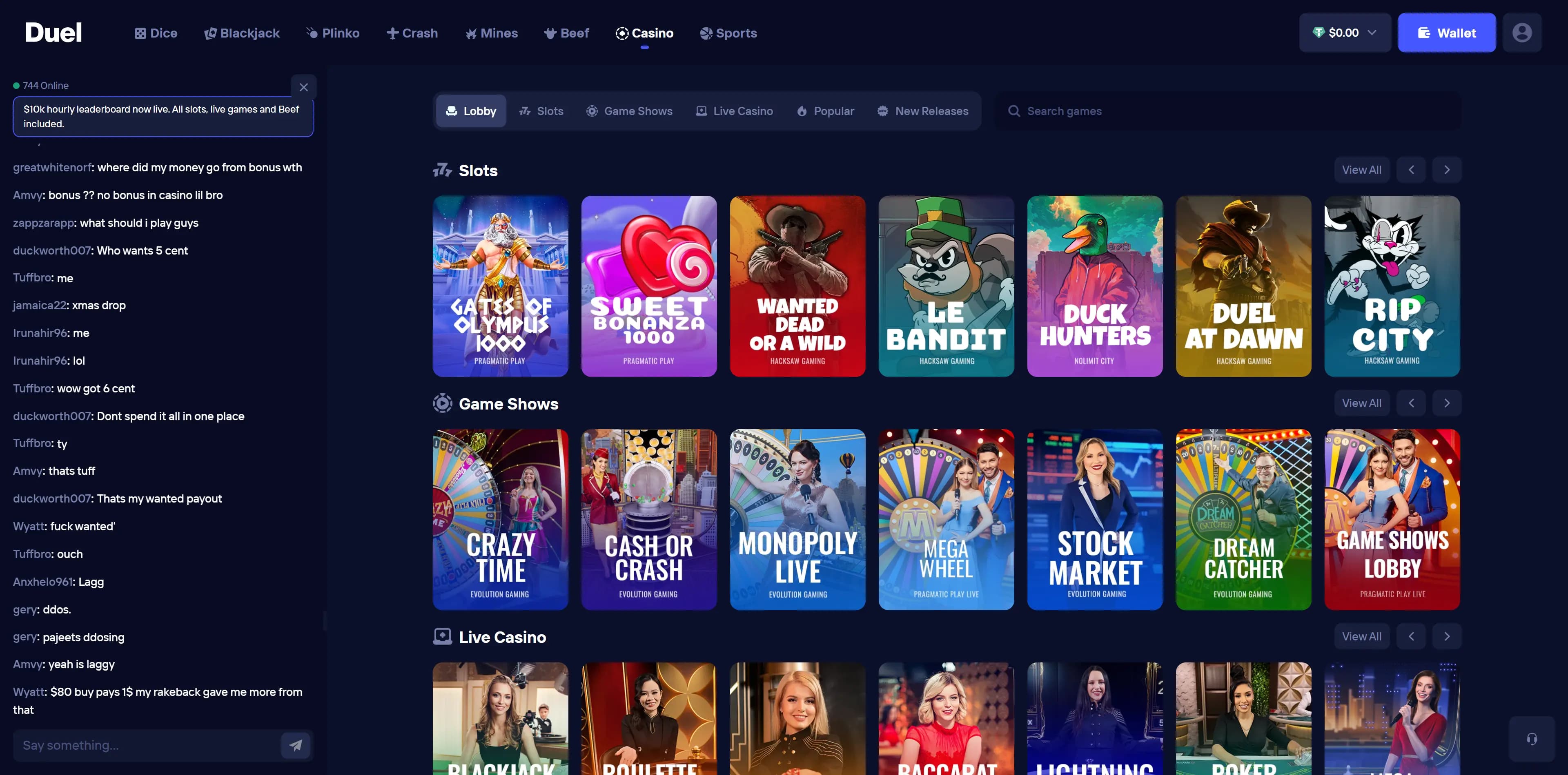 They also have a large selection of 3rd party provider games, and with EVERY game you will receive 50% of the house edge as INSTANT rakeback. No waiting for weekly and monthly rewards, Duel has simply better returns, instantly. Duel has 1000s of slots and live games, with all the classics such as Crazy Time, Duck Hunters and Gates of Olympus, available.